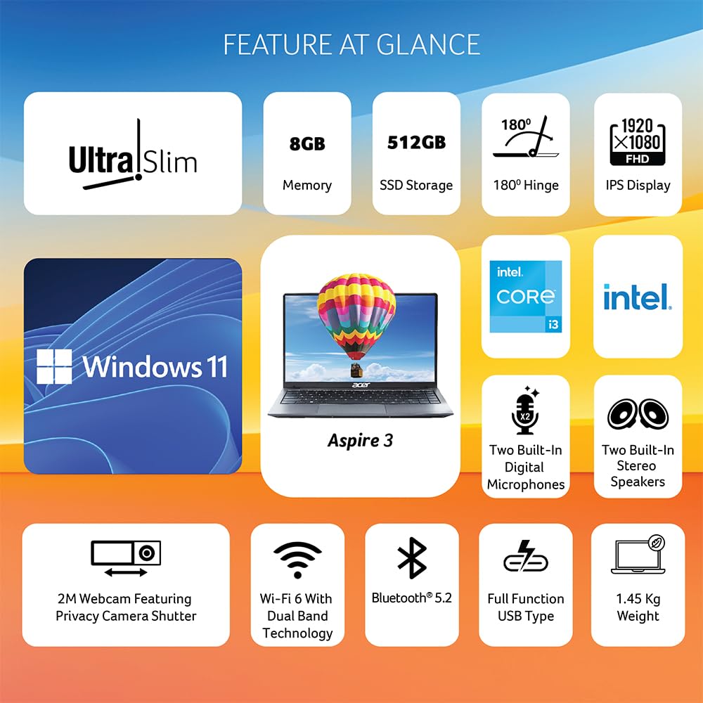 ACER ASPIRE 3 A324-51 CORE i3-1215U 12TH GEN/8GB/512GB SSD/14"FHD/WINDOWS 11/STEEL GRAY